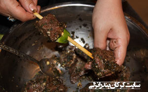 پیاز را رنده کرده با گردو مولینکس شده،انار ترش سابیده،سبزی معطر، رب انار که در ۱ ق غ آب رقیق شده (یا ۲ ق غ رب انار رقیق) و فلفل مخلوط می کنیم. گوشت را افزوده و ۳ ساعت استراحت در یخچال می دهیم . کیوی را رنده کرده همراه نمک به مخلوط میافزاییم ، نیم ساعت میگذاریم بماند سپس به سیخ کشیده و کباب می کنیم (اگه رو منقل اینکارو بکنید خیلی خوشمزه تره) این کباب مخصوص شمالی هاست و فوق العاده ترد و خوشمزه ست.