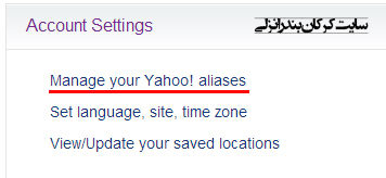 پس از ورود به صفحه بعد، بر روی Manage your Yahoo! aliases در زیرمجموعه Account Settings کلیک کنید.