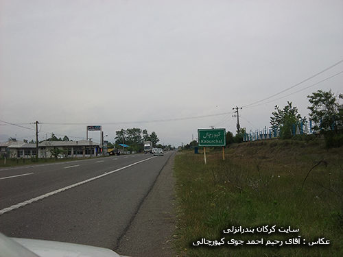 تابلوی ورودی روستای کپورچال در سمت راست و دورنمایی ازجاده آستارا و چلوکبابی پرویز در سمت چپ تصویر